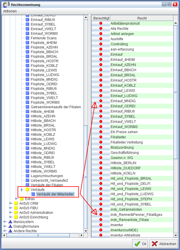Wenn nun die Rechte alle vergeben wurden, mit dem 'OK' Button das ganz speichern. Der Dialog 'Rechtezuweisung' schließt sich nun.