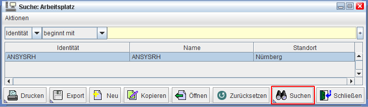 Es öffnet sich der Suchdialog für die Arbeitsplätze. Klicken Sie hier einfach auf die Schaltfläche 'Suchen'. Nun sehen Sie alle Arbeitsplätze die eingetragen sind. In unserem Beispiel ist nur einer vorhanden.