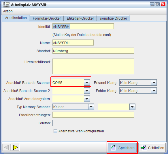 Indem sich nun öffnenden Dialog sehen Sie unter dem Reiter 'Arbeitsstation' - in der Regel gleich der erste Reiter - die Eingabemöglichkeit bzw. Auswahlmöglichkeit für 'Anschluss Barcode-Scanner'.