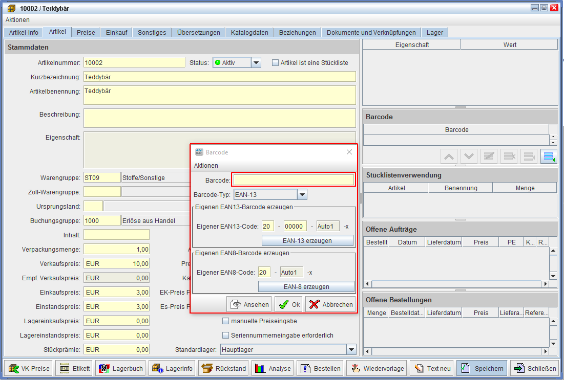 Jetzt überprüfen Sie, ob der Barcode-Hand-Scanner auch funktioniert. Dazu öffnen Sie einfach einen Artikel. In der Konfiguration sollte natürlich die Funktion, das Sie Barcodes verwenden aktiviert sein.