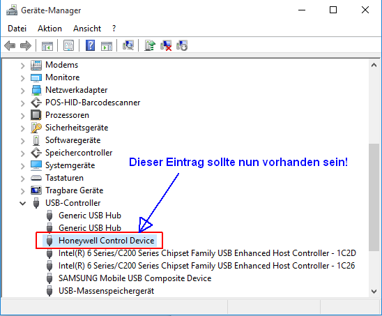 - Prüfen Sie nun, ob der USB-Gerätetreiber installiert wurde. Gehen Sie in den Gerätemanager und erweitern Sie 'USB-Controller'. Suchen Sie nach den Eintrag 'Honeywell Control Device'. Ein Bild finden Sie unten als Beispiel.
