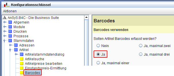 Diese Einstellung ist zu finden in Modul 'AnSyS Einrichtung' > 'Verwaltung' > 'Konfiguration' > 'Stammdaten' > 'Artikel' > 'Barcodes'. Sollte das noch nicht der Fall gewesen sein, nehmen Sie die entsprechenden Einstellungen vor und starten unser AnSyS.B4C neu, da die Konfiguration verändert wurde.