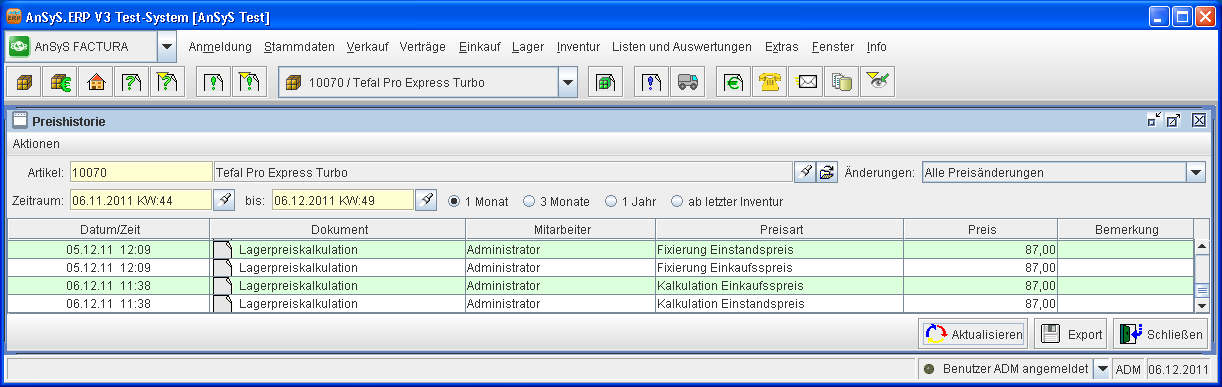 Hier sehen Sie nun in der Tabellenansicht einmal die Fixierung und zum zweiten die neue Kalkulierung der Lagereinkaufs-/einstandspreise. Und jedes mal, wenn Sie eine neue Preisfixierung und eine neue Lagerpreiskalkulation vornehmen, entstehen hier neue Einträge in der Preishistorie. In unserem Beispiel sind die Preise nicht so sehr abweichend voneinander. Wenn Sie diese zwei Schritte durchgeführt haben, ist die Lagerbewertung somit abgeschlossen.