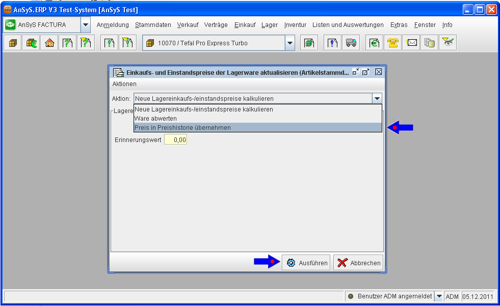 In dem sich nun öffnenden Dialog, wählen Sie in dem Auswahlfeld 'Aktion' → 'Preis in Preishistorie übernehmen'. Anschließend klicken Sie auf 'Ausführen