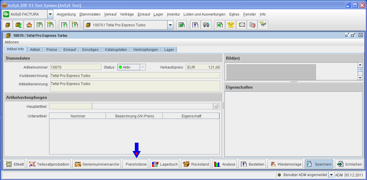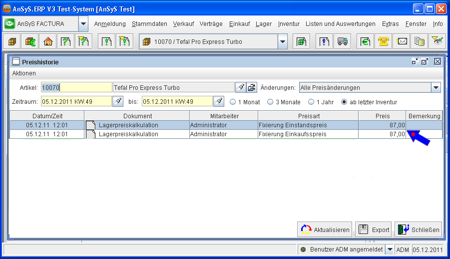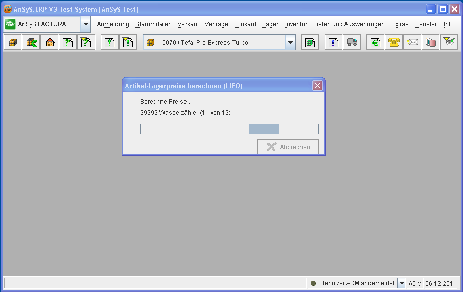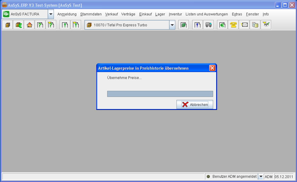 Nun wird die Lagerbewertung durchgeführt. Dies kann unter Umständen einige Minuten dauern. Ist dass berechnen der neuen Lagereinkaufs-/einstandspreise beendet, navigieren Sie wieder in den Artikelstammdaten in die Preishistorie, wie bereits in der Abbildung 4 bis Abbildung 5 gezeigt.