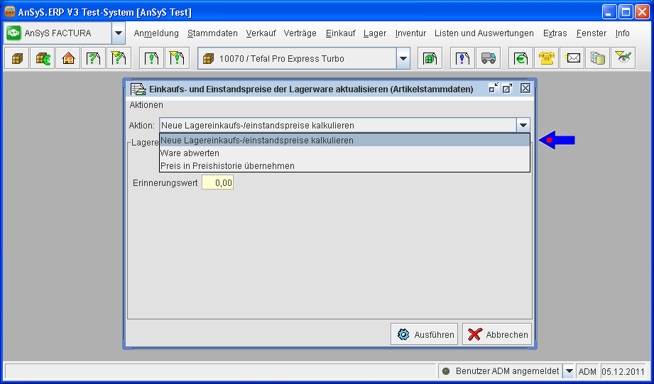 Allerdings wählen Sie jetzt in der Auswahlbox bei 'Aktion' → 'Neue Lagereinkaufs-/einstandspreise kalkulieren' aus.
