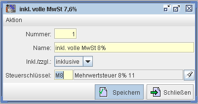 Im Menü „Basisstammdaten“ ENTHALTENE MEHRWERTSTEUER werden die angelegten Einträge für „inkl. volle MwSt 7,6%“ und „zzgl. volle MwSt 7,6%“ geändert. Die Benennung kann abweichend sein. Mit einem Doppelklick öffnen Sie den Zeileneintrag, der abgeändert werden muss. In unserem Beispiel ist das der erste Eintrag mit „inkl. volle MwSt 7,6%“. Hier ändern Sie auf jeden Fall den Steuerschlüssel mit dem zuvor neu angelegten Steuerschlüssel „Mehrwertsteuer 8%“ und eventuell auch die Benennung – wie in unserem Beispiel.