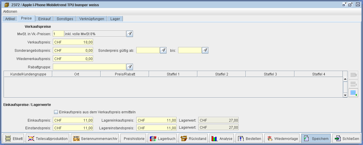Im Menü „Stammdaten“ ARTIKEL öffnen Sie über den Ihnen bekannten Suchdialog einen Artikel. In der Karteikarte PREISE muss die Einstellung der enthaltenen Mehrwertsteuer jetzt den aktuellen Mehrwertsteuersatz enthalten.