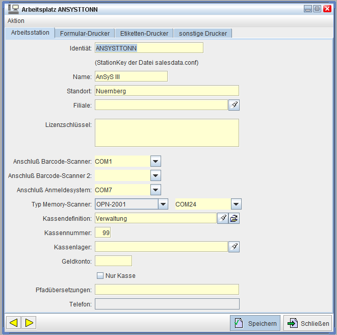 Am Arbeitsplatz (Beispiel: 'ANSYSTTONN') ist die COM-Schnittstelle zu hinterlegen, an dem das Kellnerschloss angeschlossen ist. (Arbeitsplatz = PC)