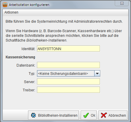 Menüzeile → Info → Systeminformationen → Bearbeiten → Setup, dann sehen Sie den Dialog wie oben gezeigt. In dem Feld 'Identität' tragen Sie nun die Arbeitsplatz/Station ein, wie er eben angelegt wurde. In unserem Beispiel: 'ANSYSTTONN'