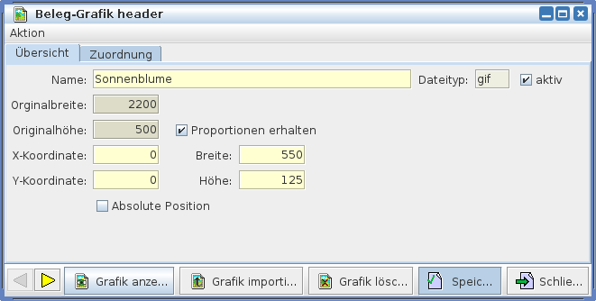 Rechts oben neben dem Feld "Name" finden Sie noch einen Haken "aktiv". Mit diesem können Sie die Grafik aktivieren bzw. deaktivieren. Ist die Grafik inaktiv, so erscheint sie auch auf keinem Beleg.