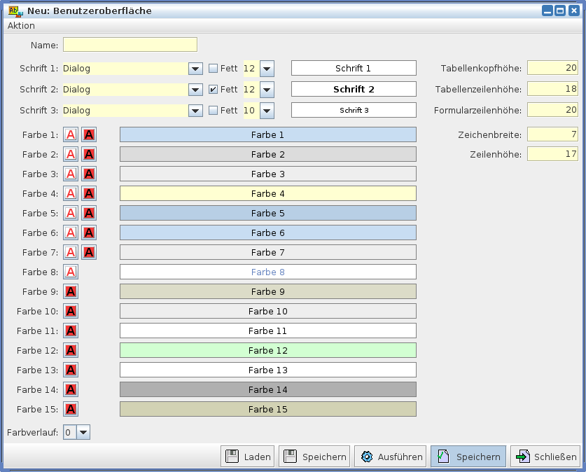 Der Benutzeroberflächendialog ermöglicht es Ihnen AnSyS.ERP an Ihre optischen Bedürfnisse anzupassen. Sie können dort Schriftart und Schriftgröße, sowie Vorder- und Hintergrundfarbe für verschiedene Elemente wählen.
