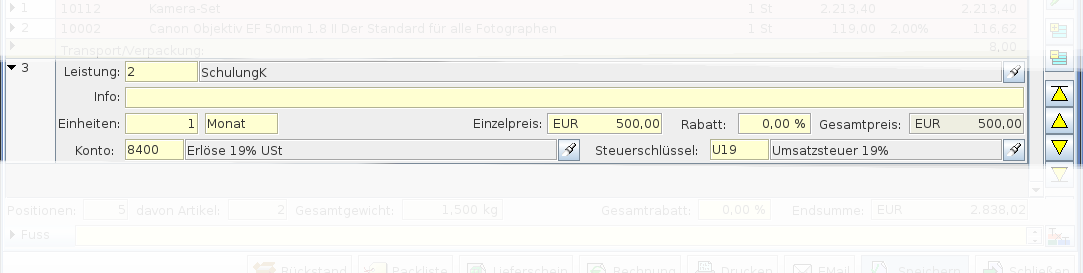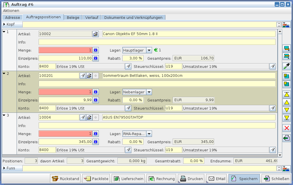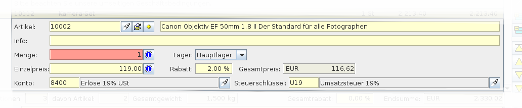 In den Artikelpositionen werden Informationen über den Artikel, Bezeichnungen, Mengen, Preise usw. erfasst.