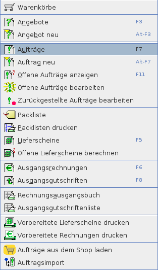 Alle weiteren Funktionen in den verschiedenen Vorgangsdialogen sind dialogabhängig (z.B. Auftrag aus Angebot erzeugen) und teilweise sogar dynamisch vom Status eines Dokuments abhängig (z.B. Löschen).