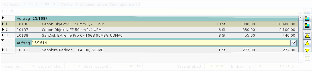 Bei den Verkaufsbelegen haben Sie die Möglichkeit bestimmte Positionen einem Auftrag zuzuordnen. Dazu fügen Sie vor die Positionen eine Auftragszuordnung ein alle Positionen bis zur nächsten Auftragszuordnung werden denn diesem Auftrag zugeordnet.