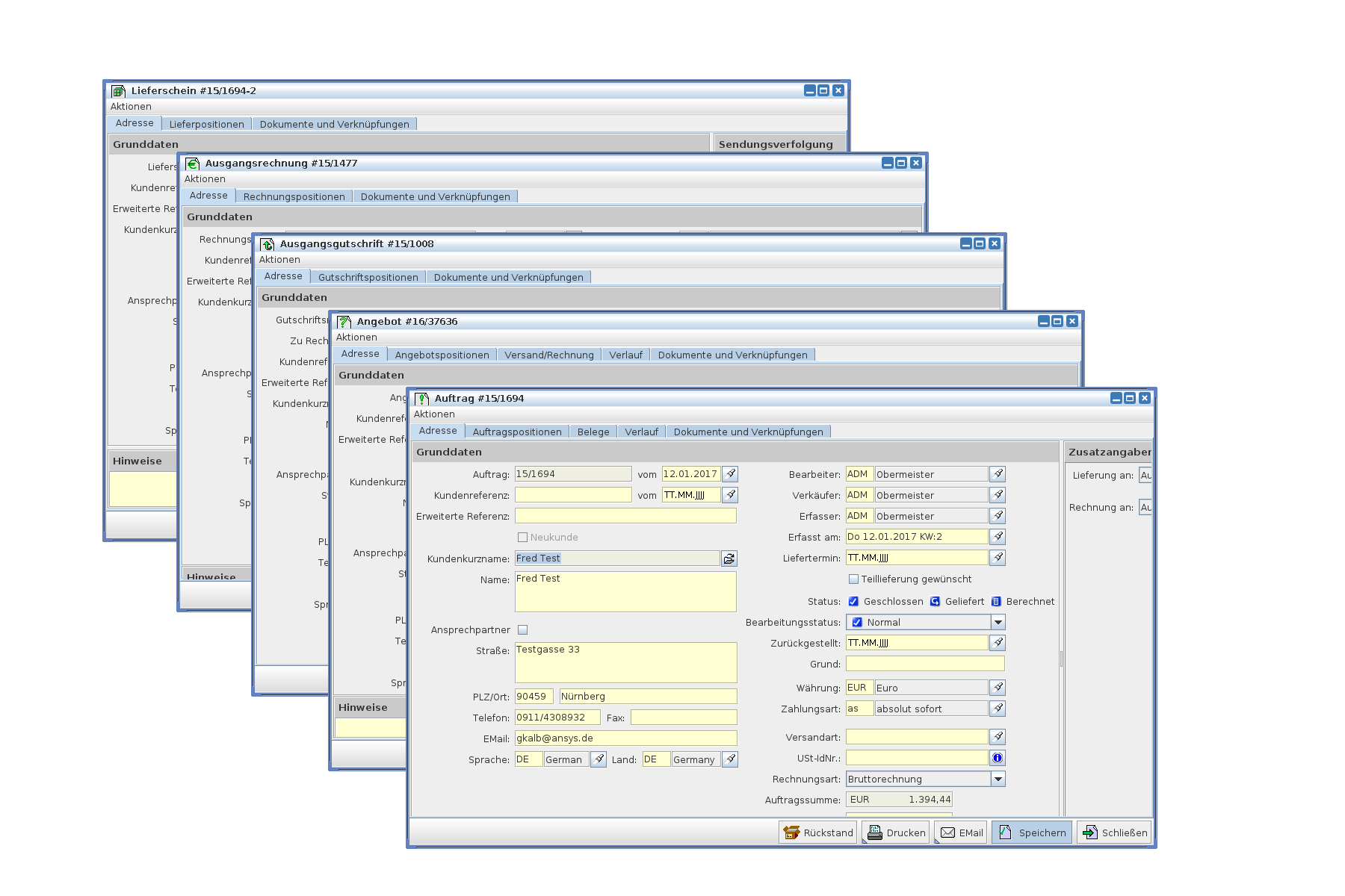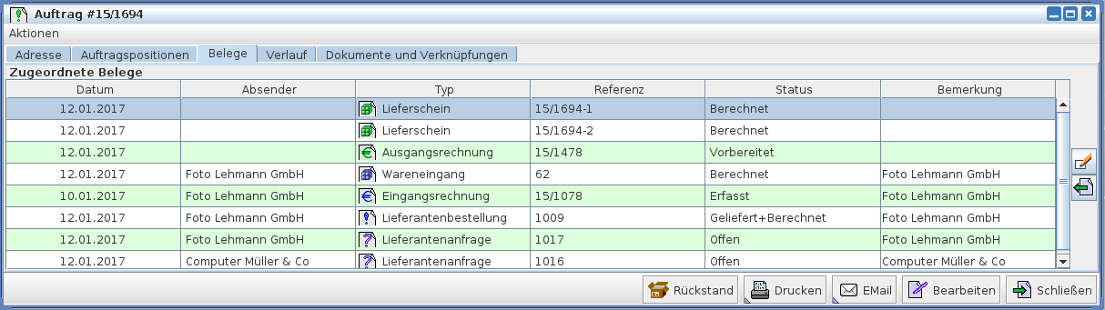 In einzelnen Vorgangsdialogen sind die Kopfinformationen auf mehrere Karteikarten verteilt. Ein Beispiel dafür ist der Auftragsdialog, wo zusätzliche Rechnungs- und Lieferanschriften auf einer weiteren Karteikarte stehen. Ebenso werden teilweise weitere Karteikarten verwendet, um die einem Vorgang zugeordneten Texte aufzulisten oder beispielsweise die im Rahmen eines Auftrags erstellten Lieferscheine, Rechnungen und Gutschriften anzuzeigen.