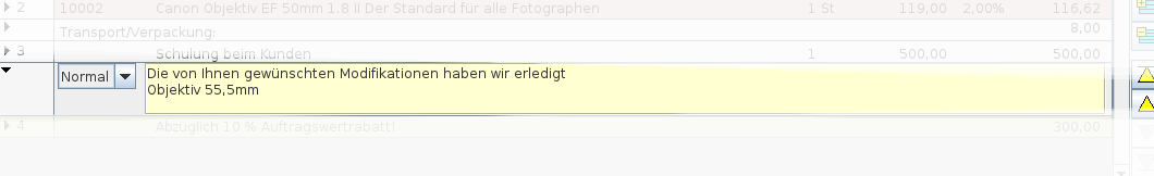 In allen Belegtypen haben Sie die Möglichkeit Textpositionen zu erfassen. Diese Textpositionen werden beim Belegdruck an die entsprechende Stelle im Dokument gedruckt, Sie können dabei zwischen drei Druckvarianten wählen: