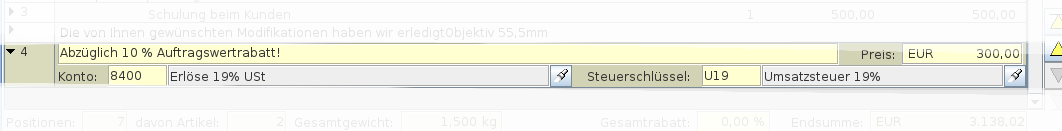 Die Positionsart Text mit Wert gibt Ihnen die Chance auf einer Rechnung weitere Kostenpositionen zuzufügen. Diesen Belegzeilentyp sollten Sie nur in Ausnahme fällen benutzen, da diese Erlöse nicht artikel- oder leistungsbezogen ausgewertet werden können.