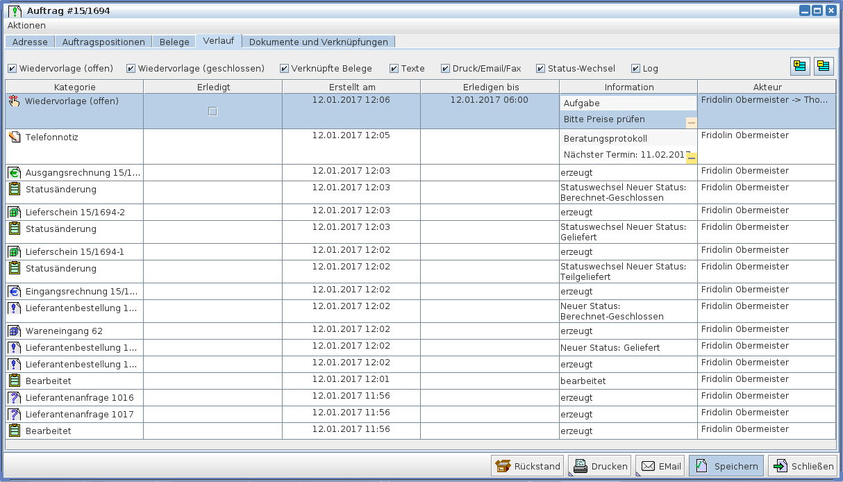Nun sehen Sie ein Bild des Reiters "Verlauf". Hier können sie Checkboxen auswählen mit denen Sie einstellen können ob Sie Wiedervorlagen, Verknüpfte Belege, Texte, Druck/E-Mail/Fax, Status-Wechsel und/oder Logs zeitlich geordnet betrachten möchten.