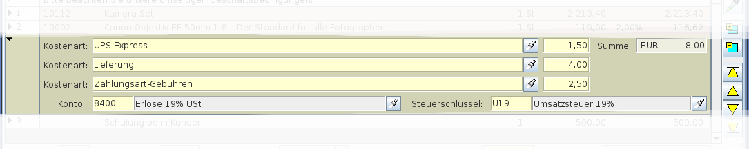 In der Versandkostenposition können Sie bis zu drei unterschiedliche Versandkosten wählen. Diese Kosten werden auf dem Beleg nicht in den Positionsbereich gedruckt sondern in den Summenbereich integriert.