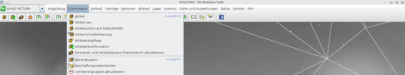 Alle Programmteile können aus dem Menüsystem heraus gestartet werden. Im Hauptbild von AnSyS.B4C, welches nach dem Start und der Anmeldung erscheint, wird im oberen Bereich direkt unter der Titelleiste die Hauptmenüleiste angezeigt. Hier werden verschiedene Menüs angezeigt, die bei Aktivierung eine Liste mit Menüpunkten anzeigen.