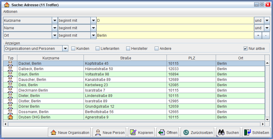 Die Suchkriterien können durch Anklicken mit der linken Maustaste aus einer Liste ausgewählt werden. Die gängigsten Suchkriterien sind bereits angezeigt und können bei Bedarf verändert werden. Werden mehrere Zeilen mit Suchkriterien angezeigt, dann können diese auch kombiniert werden. So können z.B. Kunden, deren Namen mit ‚D’ beginnt und die ihren Sitz in Berlin haben, gesucht werden: