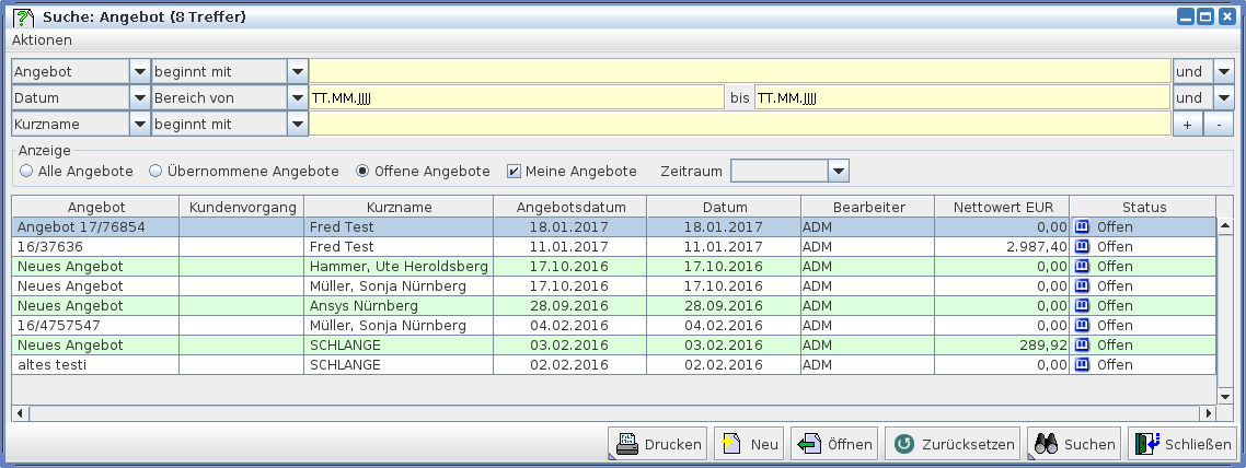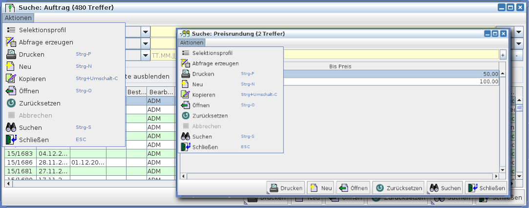 Sind in einem Suchfenster mehrere Zeilen für Suchkriterien vorhanden, dann kann durch Betätigen der Tastenkombination Strg-1, Strg-2 usw. mit dem Cursor direkt in die 1., 2. oder jede weitere Zeile gesprungen werden. Durch nochmaliges Betätigen springt der Cursor in die Auswahl des Suchkriteriums der entsprechenden Zeile. Dort kann durch Betätigen der Cursor-Tasten, Cursor-auf und Cursor-ab, ein Kriterium ausgewählt und mit Betätigen der Enter-Taste aktiviert werden. Durch nochmaliges Betätigen der Taste Strg-1 (oder Strg-2, etc.) springt der Cursor wieder in das Eingabefeld zu dem Suchkriterium. Zusätzlich können in in vielen Suchdialogen der Belegverwaltung, die jeweils aus einem Suchfeld, einem Vergleichsoperator und einem Vergleichsfeld bestehen, meist weitere Kriterien mit Hilfe von Checkboxen gewählt werden. Die Checkboxen dieser Zusatzkriterien befinden sich in einem eigenen Dialogbereich zwischen dem Bereich der Selektoren und der Tabelle für das Suchergebnis.Als Beispiel hierfür sei die Einschränkung des Suchergebnisses der Angebotssuche auf offene Angebote und/oder die eigenen Angebote genannt.