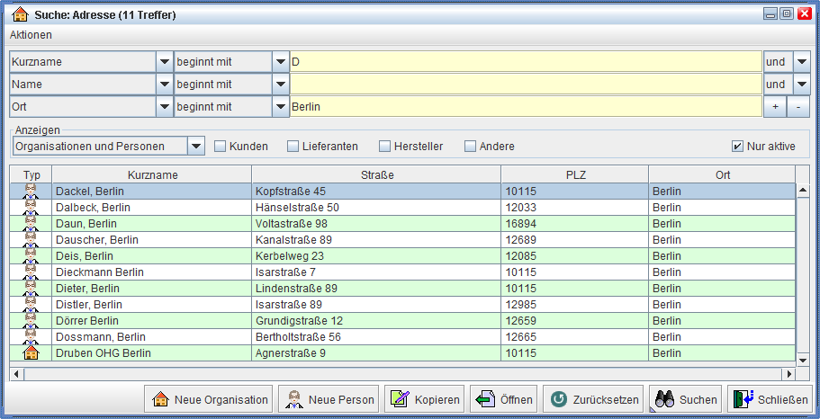 Die Suchkriterien können durch Anklicken mit der linken Maustaste aus einer Liste ausgewählt werden. Durch Anklicken der Schaltfläche [Suchen] (oder Betätigen der Tastenkombination Strg-S) werden alle Stammdaten angezeigt, die den eingegebenen Kriterien entsprechen. Wird kein Kriterium angegeben, dann werden alle Daten angezeigt. Da dies zum Teil sehr viele Daten sein können, beispielsweise bei Artikeldaten, ist die Angabe wenigstens eines Kriteriums meist sehr sinnvoll und wird teilweise auch vom Programm erzwungen. Die gängigsten Suchkriterien sind Kurzname, Name und Ort und können bei Bedarf verändert werden. Werden mehrere Zeilen mit Suchkriterien angezeigt, dann können diese auch kombiniert werden. So können z.B. Kunden, deren Namen mit ‚D’ beginnt und die ihren Sitz in Berlin haben, gesucht werden.