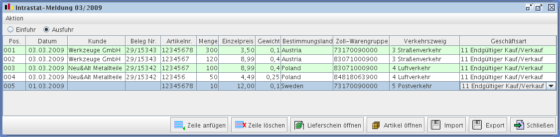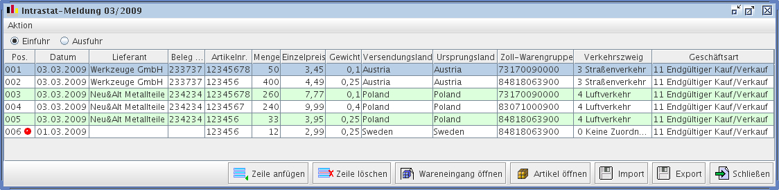 Sie haben nun eine Tabelle vor sich, an deren oberen Rand sich zwei Schaltflächen für "Einfuhr" und "Ausfuhr" befinden. Da die Daten für Einfuhren und Ausfuhren getrennt behandelt werden, können Sie mit diesen Schaltflächen zwischen "Einfuhr" und "Ausfuhr" umschalten.