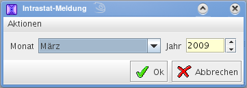 Um eine Intrastat-Meldung zu erfassen, gehen Sie ins Menü "Buchhaltung" und klicken Sie auf den Menüpunkt "Intrastat-Meldung". Es öffnet sich ein kleines Fenster, in dem Sie den Monat und das Jahr, für die Sie die Intrastat-Meldung erfassen wollen, auswählen. Bestätigen Sie anschließend Ihre Wahl mit der Schaltfläche "OK".