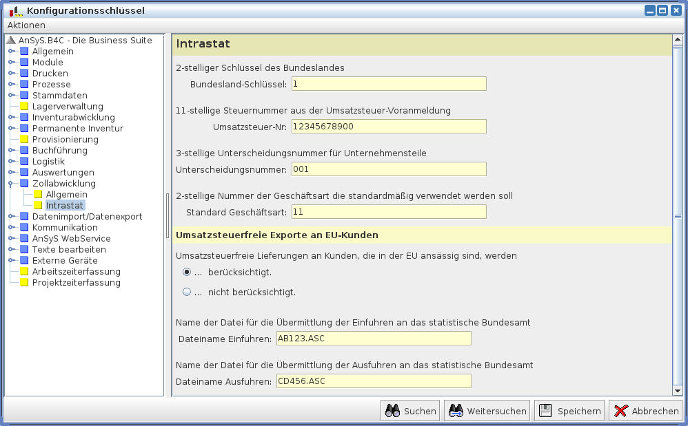 Wenn Sie wollen, dass das Programm auch umsatzsteuerfreie Lieferungen von/an Kunden, die in der EU ansässig sind, berücksichtigt, betätigen Sie die dementsprechend beschriftete Schaltfläche darunter. Als letztes geben Sie noch die, vom Statistischen Bundesamt zugewiesenen Dateinamen für Einfuhren bzw. Ausfuhren an und sichern Sie Ihre Einstellungen über die "Speichern"-Schaltfläche.
