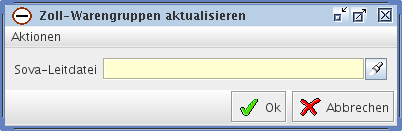 Um nun die Sova-Liste in AnSyS.ERP zu importieren, gehen Sie ins Menü "Buchhaltung" und wählen den Menüpunkt "Zoll-Warengruppen aktualisieren". Es öffnet sich ein Fenster, das einen Datei-Picker enthält, mit dessen Hilfe Sie die aktuelle Sova-Datei auswählen können. Benutzen Sie dazu die Taschenlampen-Schaltfläche.