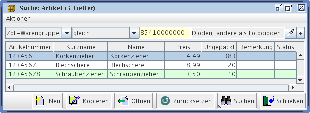 Sie sollten nun alle Artikel, die überholte Zoll-Warengruppen enthalten, einer aktuellen Zoll-Warengruppe zuordnen. Gehen Sie dazu ins Menü "Stammdaten" und wählen Sie den Menüpunkt "Artikel". Im Suchdialog wählen Sie aus den Selektoren "Zoll-Warengruppe" aus und geben Sie in den Picker dahinter die überholte Warengruppe ein um alle Artikel angezeigt zu bekommen die diese Zoll-Warengruppe enthalten. Öffnen Sie nun die Artikel und ordnen Sie ihm eine gültige Zoll-Warengruppe zu.
