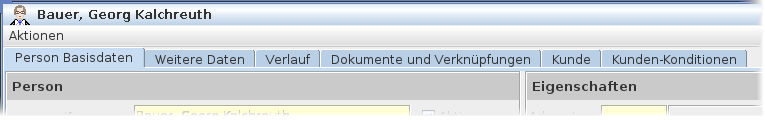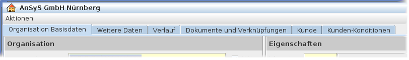 Jede gespeicherte Adresse wird durch die Karteikarten organisiert. Dazu zählen sowohl die Grundangaben wie die Basisdaten und Weitere Daten, als auch der Verlauf und die Dokumente und Verknüpfungen. Darüber hinaus können noch weitere Karteikartenreiter bei der Bearbeitung bzw. Vervollständigung der Basisdaten hinzugefügt werden.