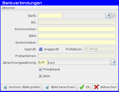 Fügt man eine neue Bankverbindung hinzu, muss man zuerst die Bank auswählen. Sobald man dann die Kontonummer eingetragen hat, besteht die Möglichkeit die IBAN automatisch berechnen zu lassen, in dem man auf die Schaltfläche am Fuß des Dialogs klickt.