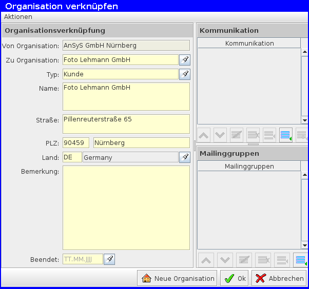 Sobald man eine neue Verknüpfung erstellen möchte oder eine schon bestehende Bearbeiten öffnet sich ein neues Fenster. Hier trägt man die Organisation ein und den Typ, beispielsweise Kunde oder Berater. Auch diese Typ-Auswahl kann in den Einrichtungen des Programm beliebig geändert werden. Alle weitere Daten der neu eingetragenen Organisation, wie die Anschrift werden automatisch ausgefüllt. Zusätzlich kann man auch hier weitere Kommunikationskanäle oder Mailinggruppen eintragen. Optional kann man eine Bemerkung schreiben und ggf. bei Beendigung der Zusammenarbeit mit der Organisation das Datum eintragen.