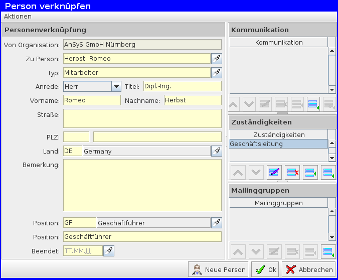 In der Spalte daneben kann man Personenverknüpfungen erstellen und verwalten. Auch hier öffnet sich bei Bearbeitung oder Erstellung einer Verknüpfung ein neues Fenster. Hier gibt es im Gegensatz zur Organisationsverknüpfung ein paar Unterschiede. Zum einem kann man optional Anrede, Land und Position eintragen und zum anderen gibt es hier die weitere Option Zuständigkeiten für die Person hinzu zufügen.