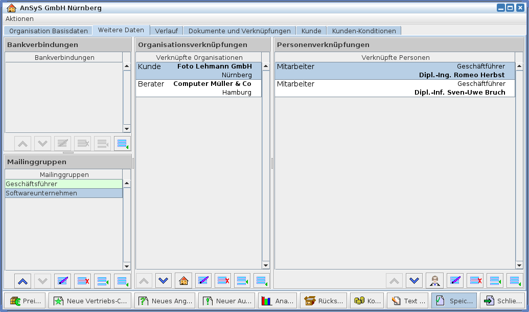 Der Karteikartenreiter "Weitere Daten" erfasst weitere wichtige Informationen. Hier werden nicht nur die Bankdaten gespeichert und verwaltet, sondern ebenso die Mailinggruppen und die Organisations-, und Personenverknüpfungen.