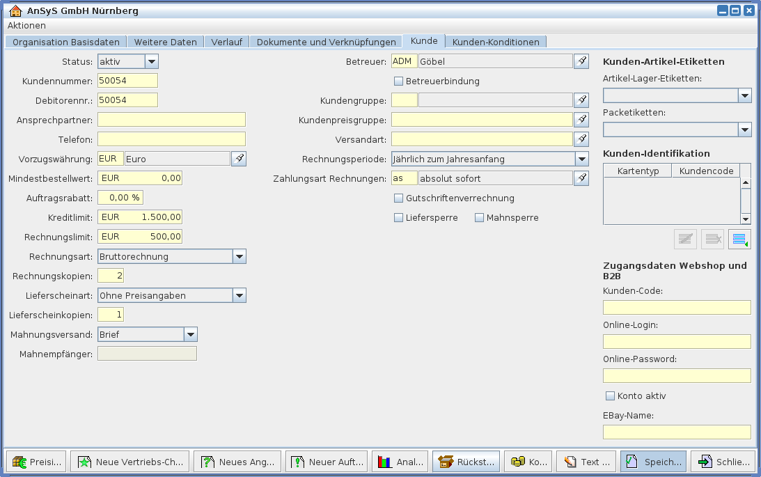Bei der Dateneingabe von Kunden ist es vor allem wichtig, die Kundennummer und die Debitorennummer zu erfassen, sowie die Vorzugswährung für die Angebots-, und Rechnungserstellung und die Zahlungsart für die Festlegung der Fähigkeiten von Rechnungen. Außerdem wird über die Rechnungsart festgelegt in welcher Form bei der Rechnungserstellung mit der Mehrwertsteuer umgegangen werden soll. Diese Angaben werden im Verkaufsdokument vom Angebot bis zur Gutschrift automatisch übernommen.