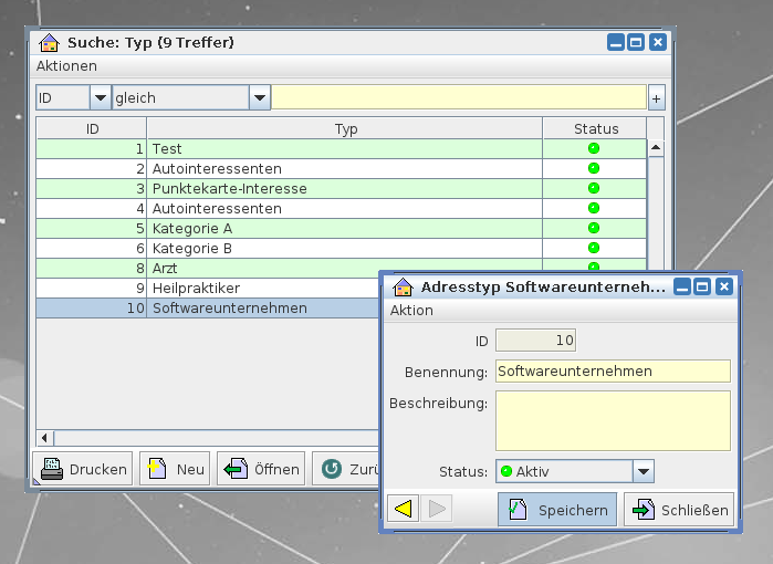 Im Prinzip ist dieser Dialog identisch mit dem, der bei den Artikeltypen erscheint. Denn auch hier geht es darum, Adressen bzw. Personen oder Unternehmen bestimmte Typen zuordnen zu können. So hat man einen direkten Überblick über seine Kunden. Im nachfolgenden finden Sie dazu eine kurze Erklärung.