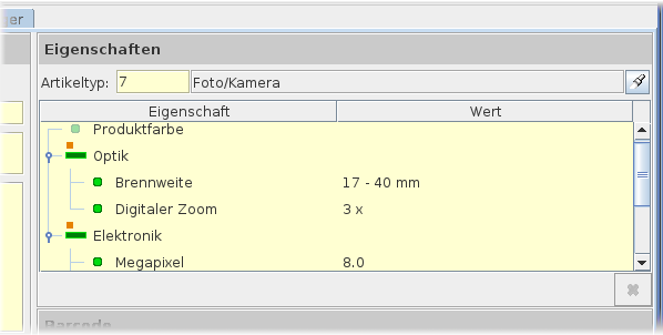 Auf der rechten Seite dieses Karteikartenreiters werden zuerst einmal die Eigenschaften festgelegt. Auch hier können die Eigenschaften beliebig in der Einrichtung des Programms bearbeitet werden. Dann besteht z.B die Möglichkeit die Produktfarbe anzugeben oder Details zur Optik und Elektronik, je nachdem um was für einen Artikel es sich handelt.