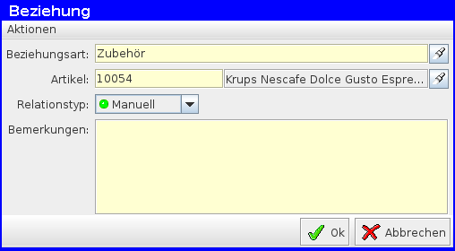 Hier kann man die Beziehungsart eintragen und/oder ändern, z.B in Zubehör oder Cross-Selling. Auch die Artikelbeziehungstypen können in den Einrichtungen des Programms geändert bzw. neue hinzugefügt werden.