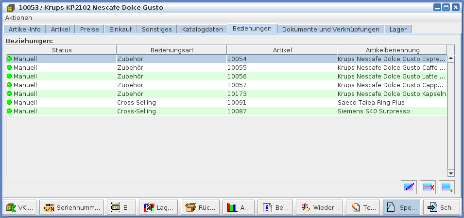 Man kann den Status, die Beziehungsart, die Artikelnummer und die Artikelbenennung herauslesen. Um einen dieser Artikel zu bearbeiten, muss man diesen auswählen und dann rechts unten auf die Bearbeitungsschaltfläche klicken. Daraufhin sollte sich ein neues Fenster öffnen.