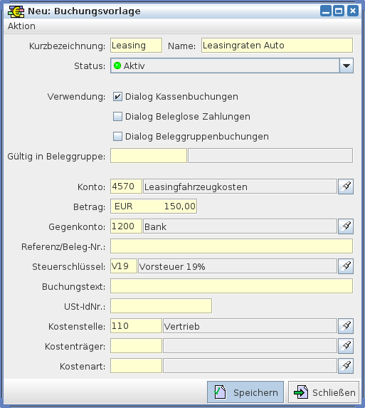 In diesem Bild werden die Daten zu einer Buchungsvorlage angegeben. Dabei haben die einzelnen Felder folgende Bedeutung: