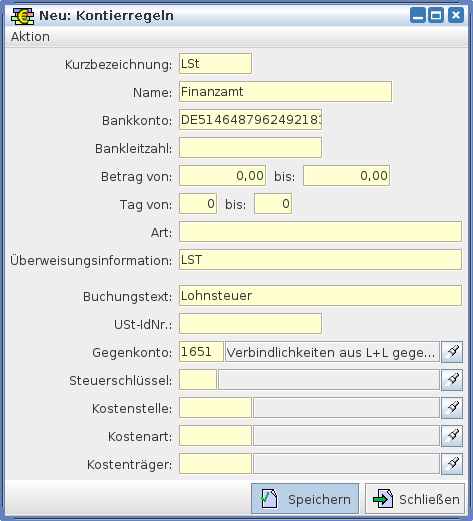 Das obige Bild zeigt ein Beispiel, für eine Kontierregel. Wichtig sind also, Kurzbezeichnung und Name so wie die Angaben zum Bankkonto. Zusätzlich kann man, je nach Nutzungszwecks der Regel einen von-bis Bereich für die Beträge eintragen und genauso auch einen Tag von-bis angeben. Weitere Angaben zur Art und ein Buchungstext (hier:Lohnsteuer), sollten auch gegeben sein. Natürlich muss auch ein Gegenkonto ausgewählt werden.