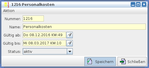 In diesem Bild werden die Daten der Kostenarten verwaltet. In dem Feld Nummer tragen sie die Nummer der Kostenart ein. Der Name ist die Benennung der Kostenart analog der Buchhaltung. In den Feldern Gültig ab bzw. Gültig bis können Sie den Zeitraum festlegen, von wann bis wann die Kostenart ihre Gültigkeit hat. Wollen Sie eine bereits abgeschlossene Kostenart nicht in der Suchmaske angezeigt bekommen, so geben Sie im Feld Status 'deaktiviert' ein.