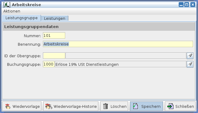 Zur Bearbeitung und zur Neuanlage von Leistungsgruppen erscheint folgendes Bild: