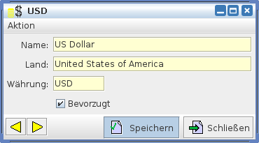 Die Währungen sind bereits vordefiniert. Eine Währung wird als bevorzugte Währung definiert, welche dann bei der Erstellung von Belegen standardmäßig vorgeschlagen wird. Die einzelnen Felder einer Währung haben folgende Bedeutung: