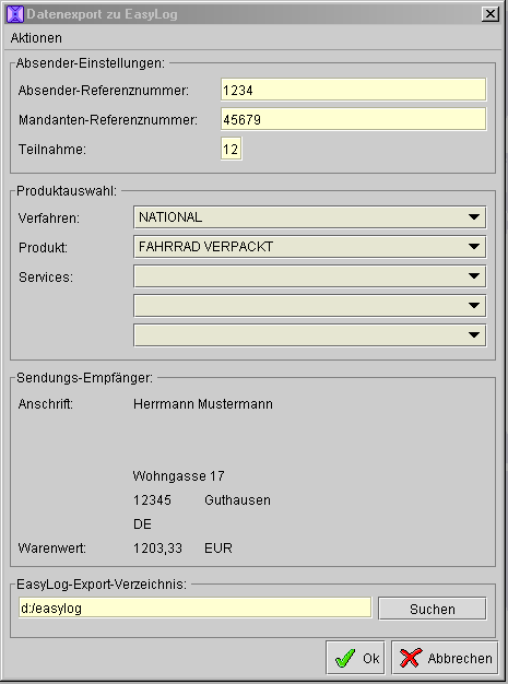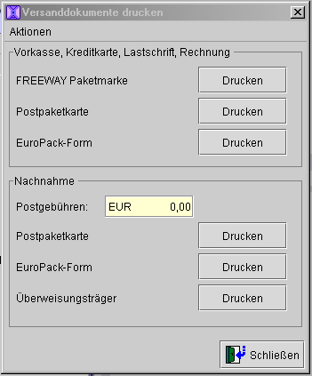 Außer den üblichen Dokumentenverarbeitungsfunktionen enthält das Menü „Aktionen“ des Lieferscheindialogs noch Funktionen für den Ausdruck von Postversandpapieren (Paketkarte, Paketmarke, Überweisungsträger usw.) und für den Export des Datensatzes zum Programm EasyLog der Firma DHL World Net. Schnittstellen zu Softwaresystemen anderer Logistikunternehmen stellen wir auf Anfrage zur Verfügung.
