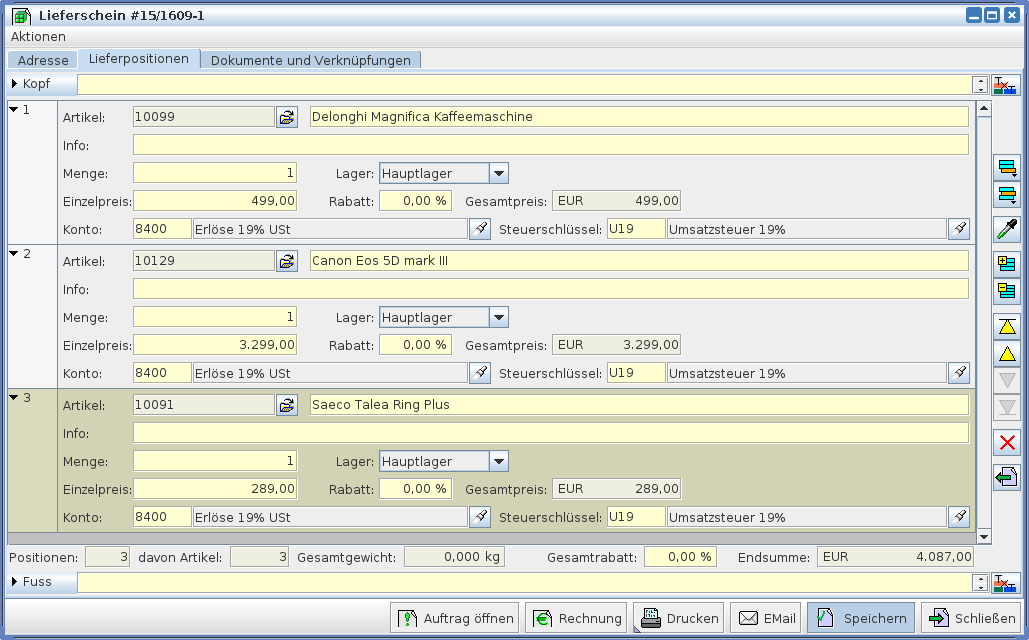 Sind alle Kopfdaten auf der Karteikarte „Adresse“ als korrekt verifiziert, kann auf die Karteikarte „Lieferpositionen“ gewechselt werden.